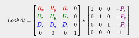 이때 시점을 카메라라고 할 때, 시점을 변경하기 위해 카메라에서 정의되는 좌표계가 필요하게 되고 물체를 바라보는 방향, 카메라의 위 방향, 앞서 두 방향에 대해 수직인 오른쪽을 가리키는 벡터가 필요하게 된다.